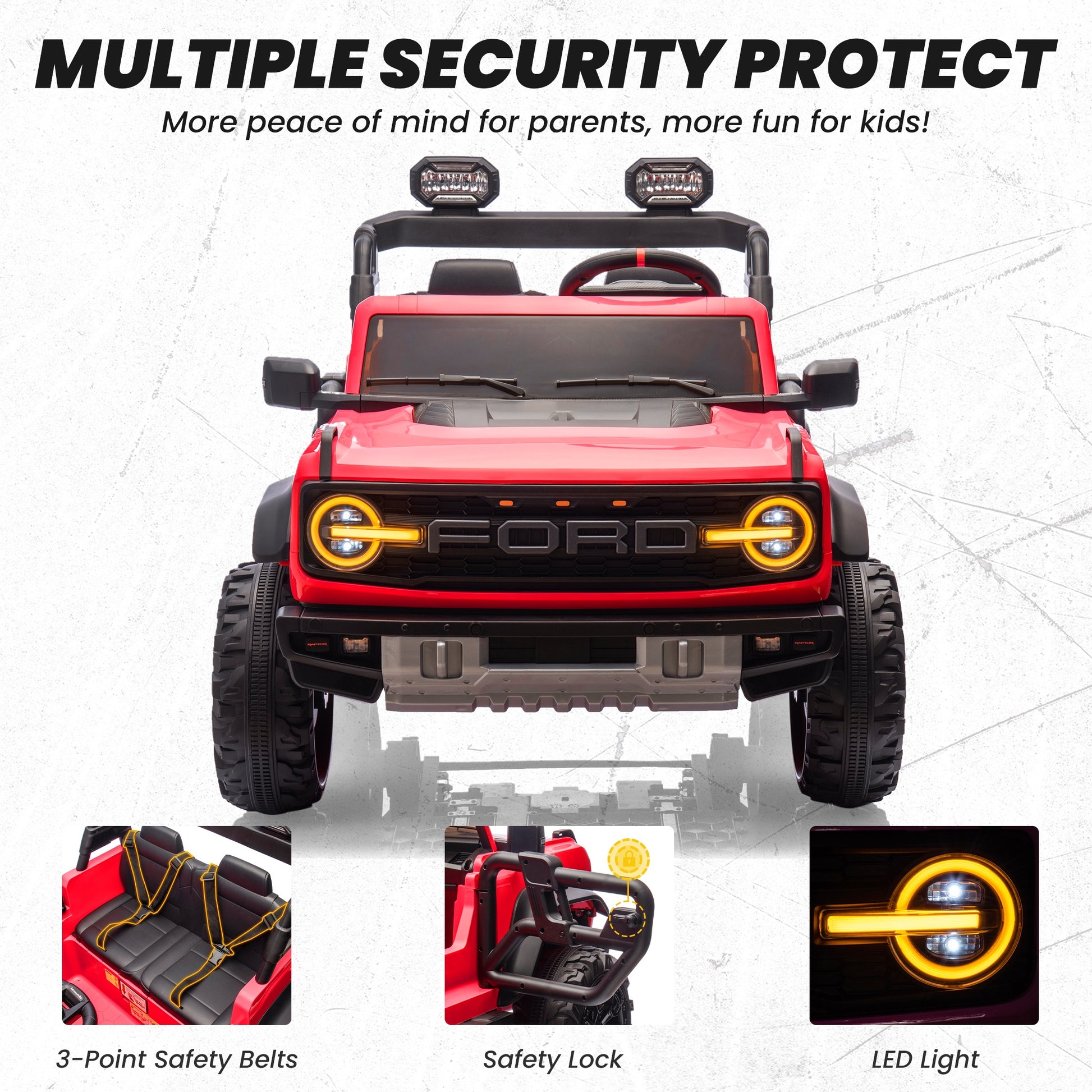 24V 2 Seater Ride on Cars, Licensed Ford Bronco Raptor Powered Ride on Toy Truck with Remote Control, Electric Car for Kids 3-8 Gifts with Bluetooth/LED Light/Spring Suspension, 4 Wheelers, Red