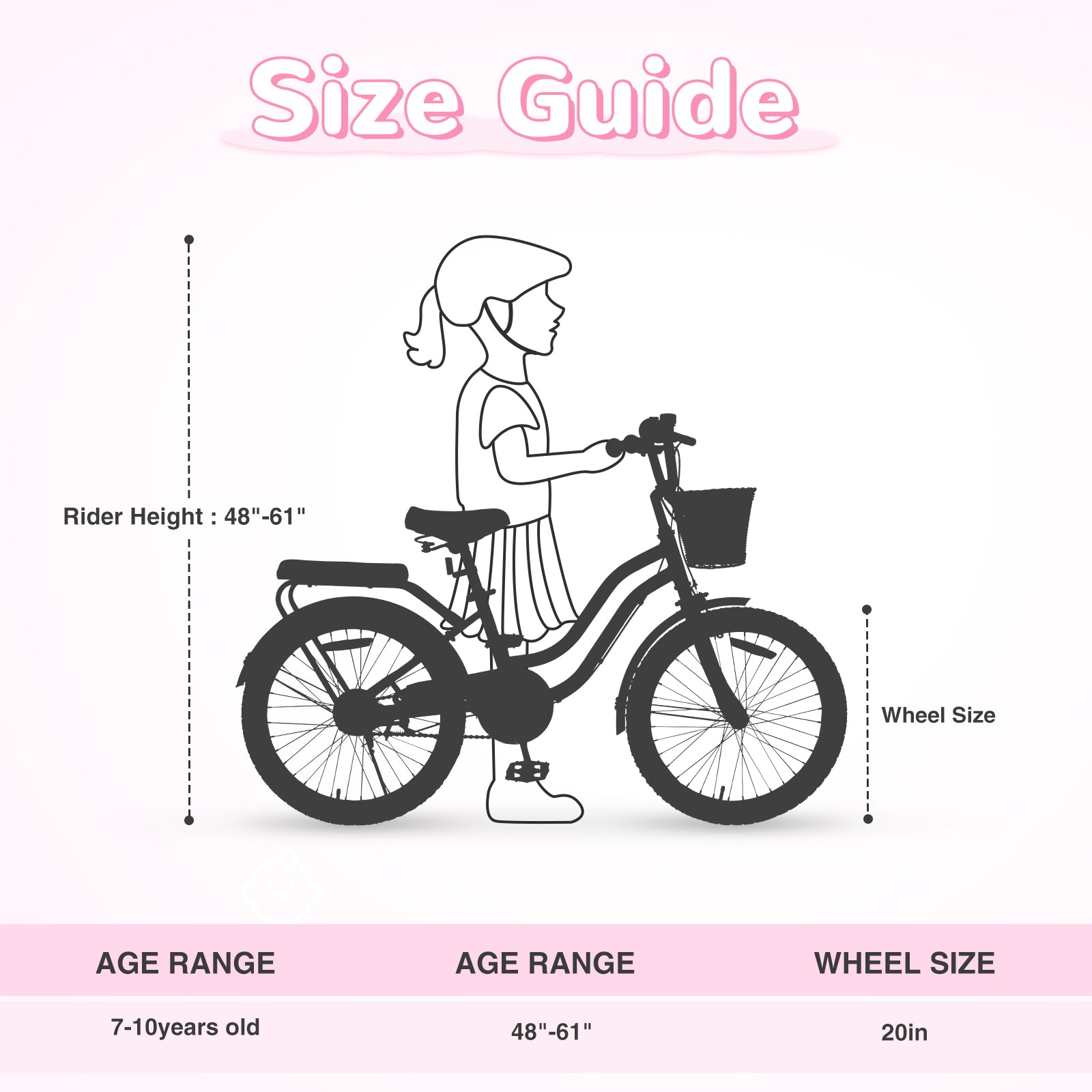 Introduce your child to the joy of cycling with our stunning 20-inch girls' bike that's designed to make every ride a delightful adventure. Built with a sturdy steel frame, this girl's bicycle promises strength and durability that can withstand the energetic play of young riders. With 85% of the assembly already complete, you can have your little one riding in no time. The elegant white leather saddle and comfy handles ensure a pleasant experience, while the high-quality 20*2.125 tires provide enhanced stability and comfort. The lower frame height makes mounting and dismounting a breeze, and the full chain guard protects small hands, feet, and clothing from getting caught, offering peace of mind for parents. Safety is our top priority, and this bike for kids 7-10 is equipped with a responsive front caliper brake and rear band brake system for smooth and efficient stopping. Plus, our girls' bike meets the CPC standards, ensuring it is safe for your child. Adding a touch of charm, this girl's bicycle features an adorable basket, ideal for carrying toys or snacks. Imagine your child riding with friends, giggling and sharing moments of joy. This kid's bike isn't just a mode of transport; it's a ticket to adventures and memories.