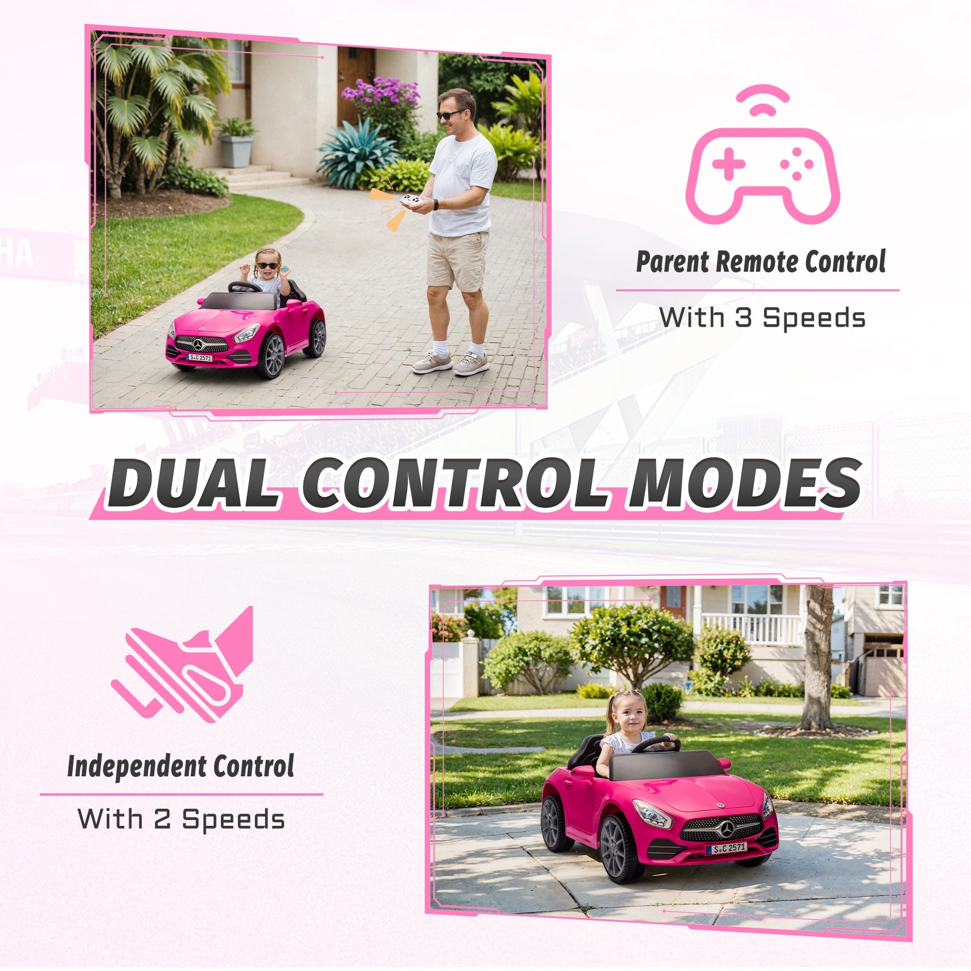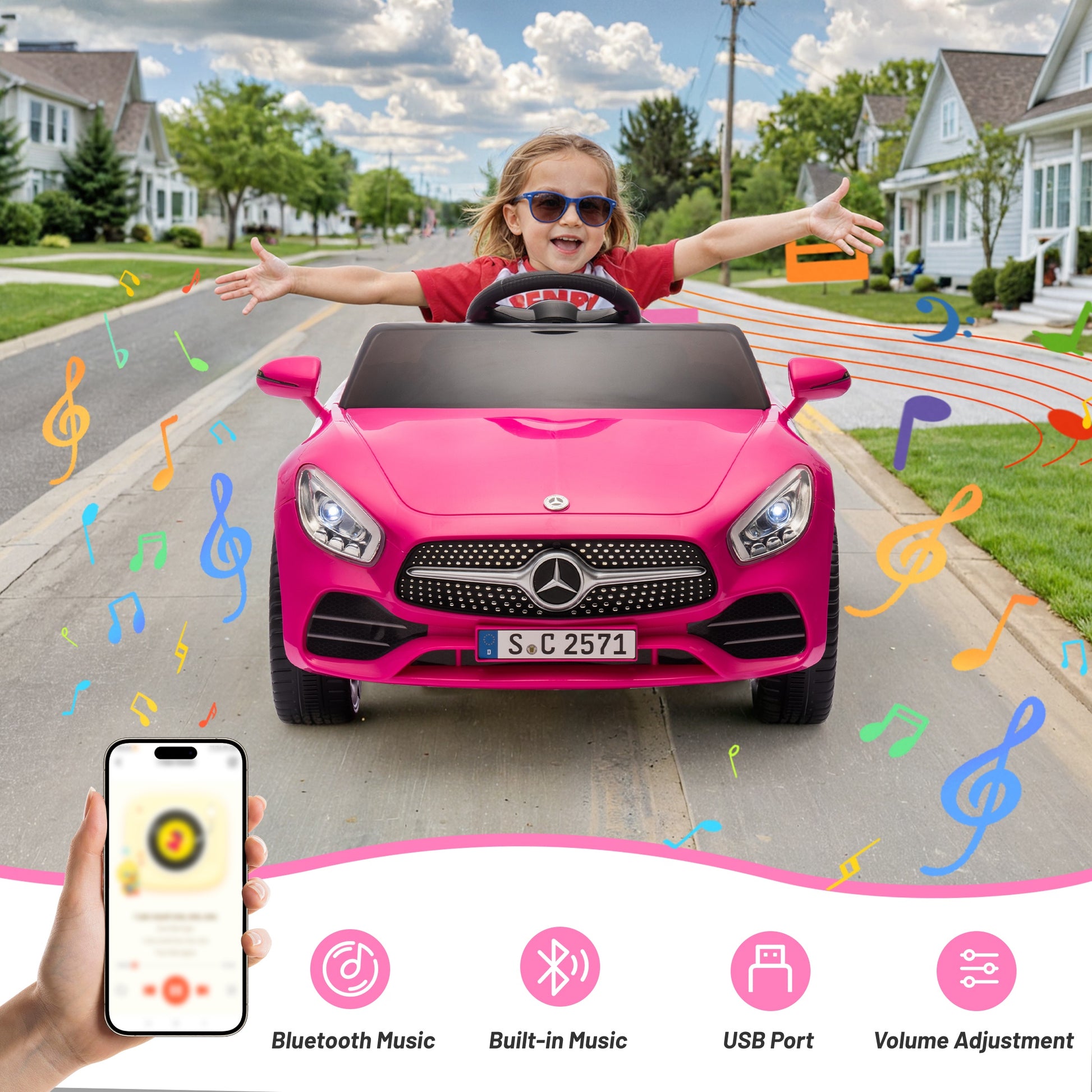 The iYofe 12V powerful ride on car is designed with double-lock doors, bright LED headlights, and a rotating steering wheel, imitating the real experience of driving a car. This 12V electric ride on car can be operated by both children and parents. The child controls the steering wheel and pedal through the one-click start, and the use of parental remote control is another way. The remote-controlled toddler ride on car features a smooth start function and a safety belt to ensure safe playtime on almost any terrain. Bluetooth, USB, and built-in music offer more options according to your child's preferences. As a gift, this 12v ride on car brings even more joy to children.