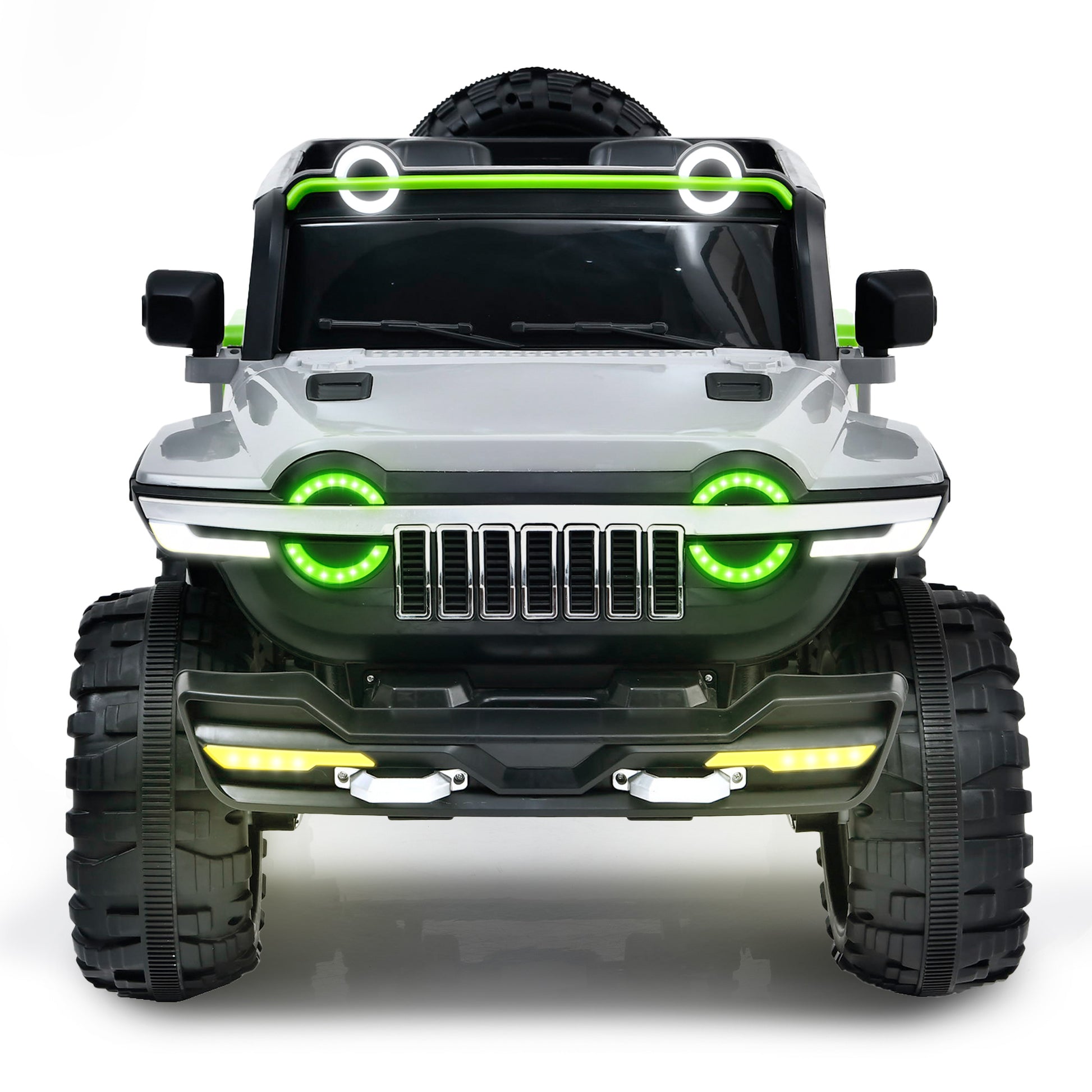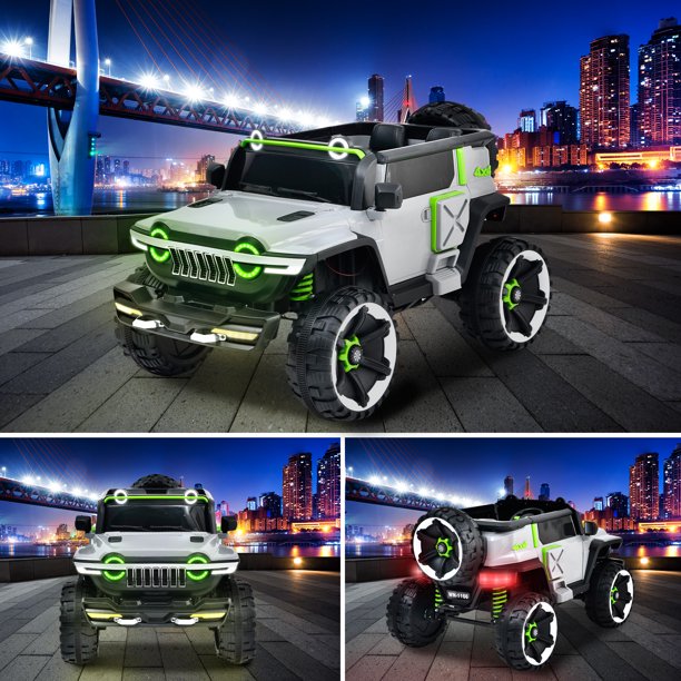 Stylish Appearance and Realistic Function - This new 12V kids ride on car truck looks like the real one. With a working Eight piece searchlight, music player, volume adjustment, power display, one-button start, 2 seat design with leather seats, big wheels, and a large steering wheel, this kid's electric car is ready to hit the road.