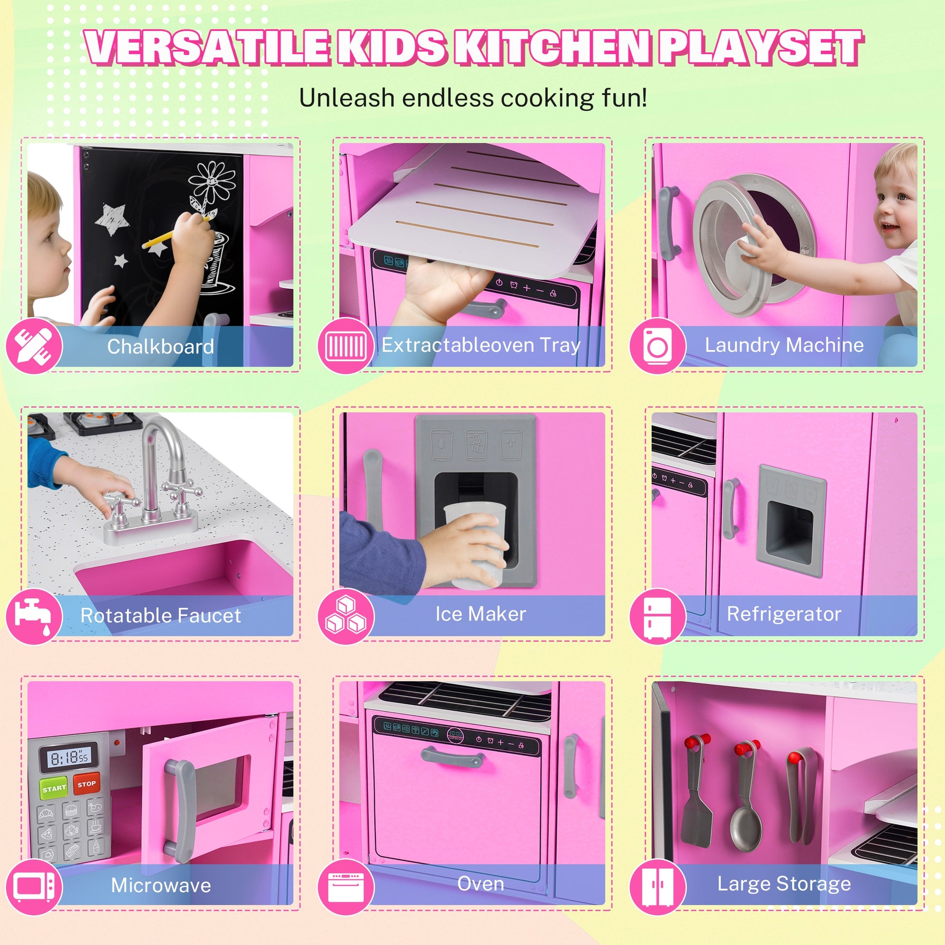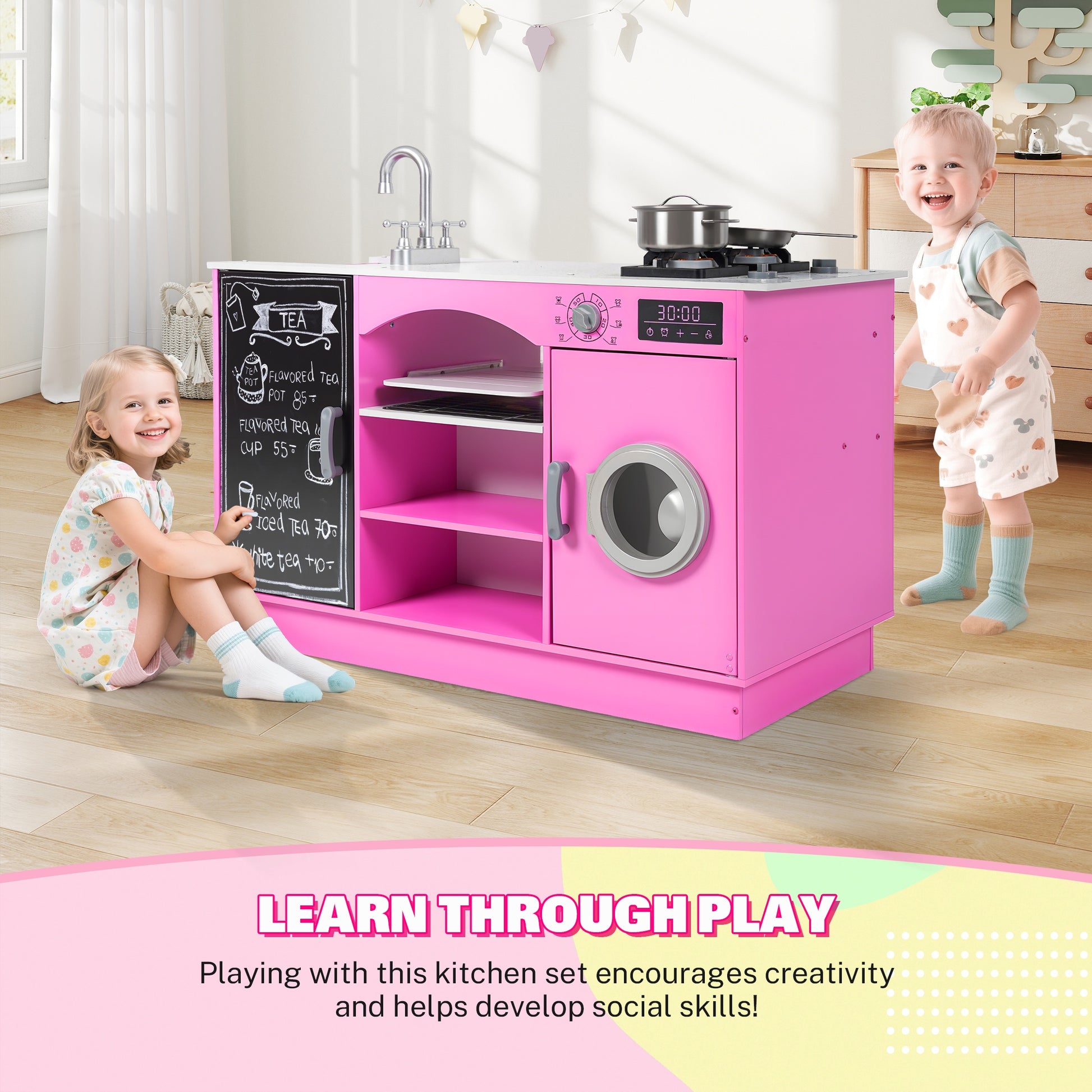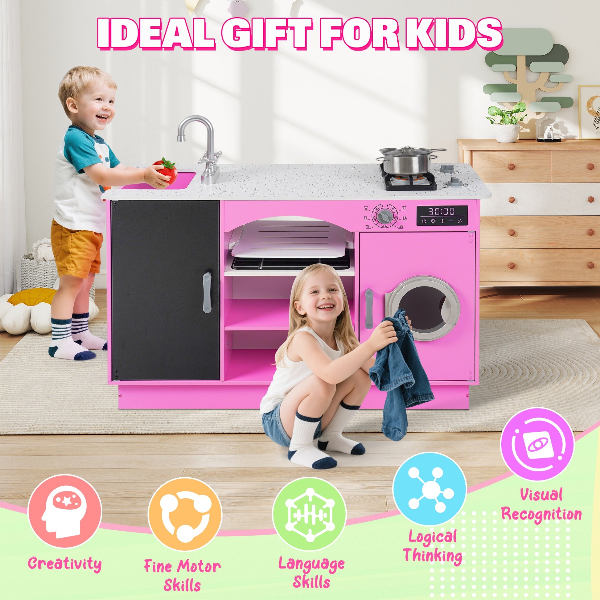 Spark your child’s imagination with this kids kitchen playset designed for toddlers aged 1-3! Featuring a realistic sink with faucet, dual stove burners with lights & sounds, and a flip-over grill, this pretend play kitchen lets little chefs "cook" using PVC utensils, stainless steel pots, and even "operate" a microwave, washing machine, and ice maker. You’ll love how the chalkboard panel encourages creativity while the hanging storage keeps tools organized – perfect for tiny hands learning through play kitchen for toddlers 3+. With 10 interactive zones and child-safe rounded edges, it’s more than a kids kitchen set; it’s a gateway to teamwork, problem-solving, and endless imaginative adventures!