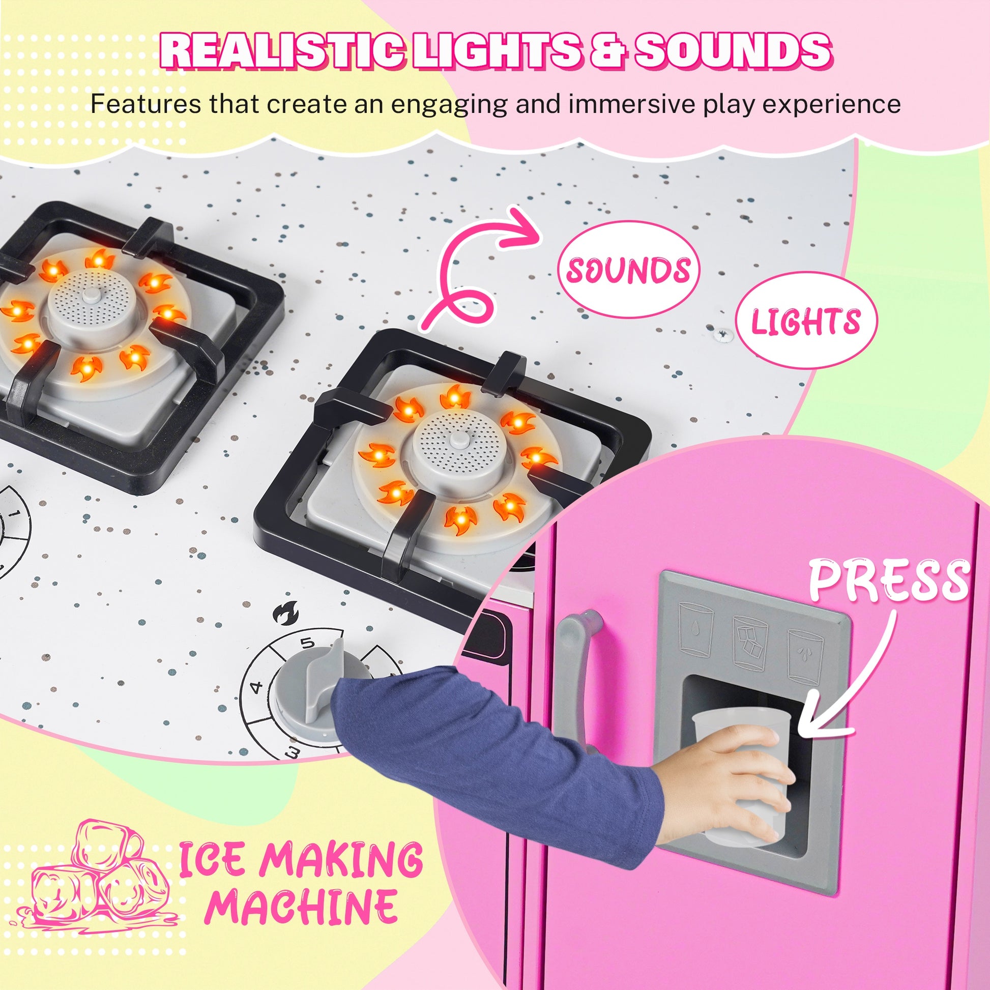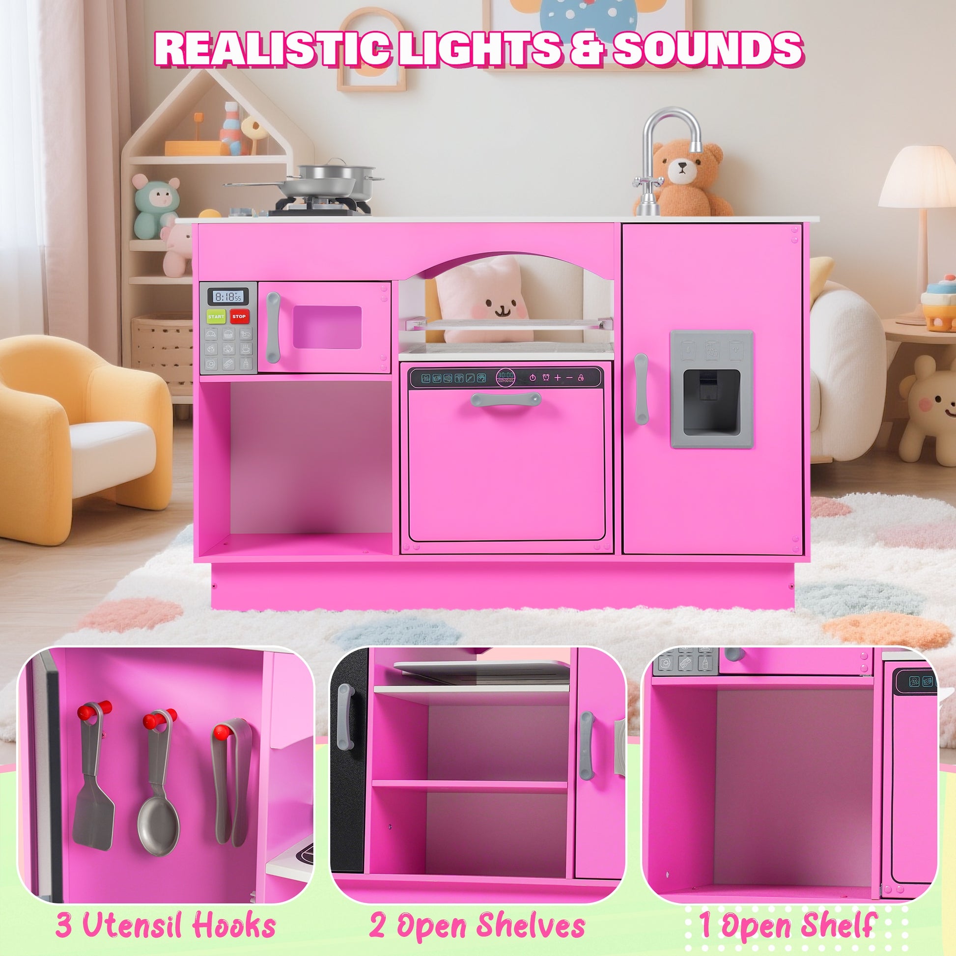 iYofe Island Play Kitchen for Kids, Wooden Kids Play Kitchen Playset Chef Pretend Play Set for Toddlers with Real Lights & Sounds, 7 Accessories, Toy Kitchen Set or Girls Boys Gift for Ages 3+, Pink