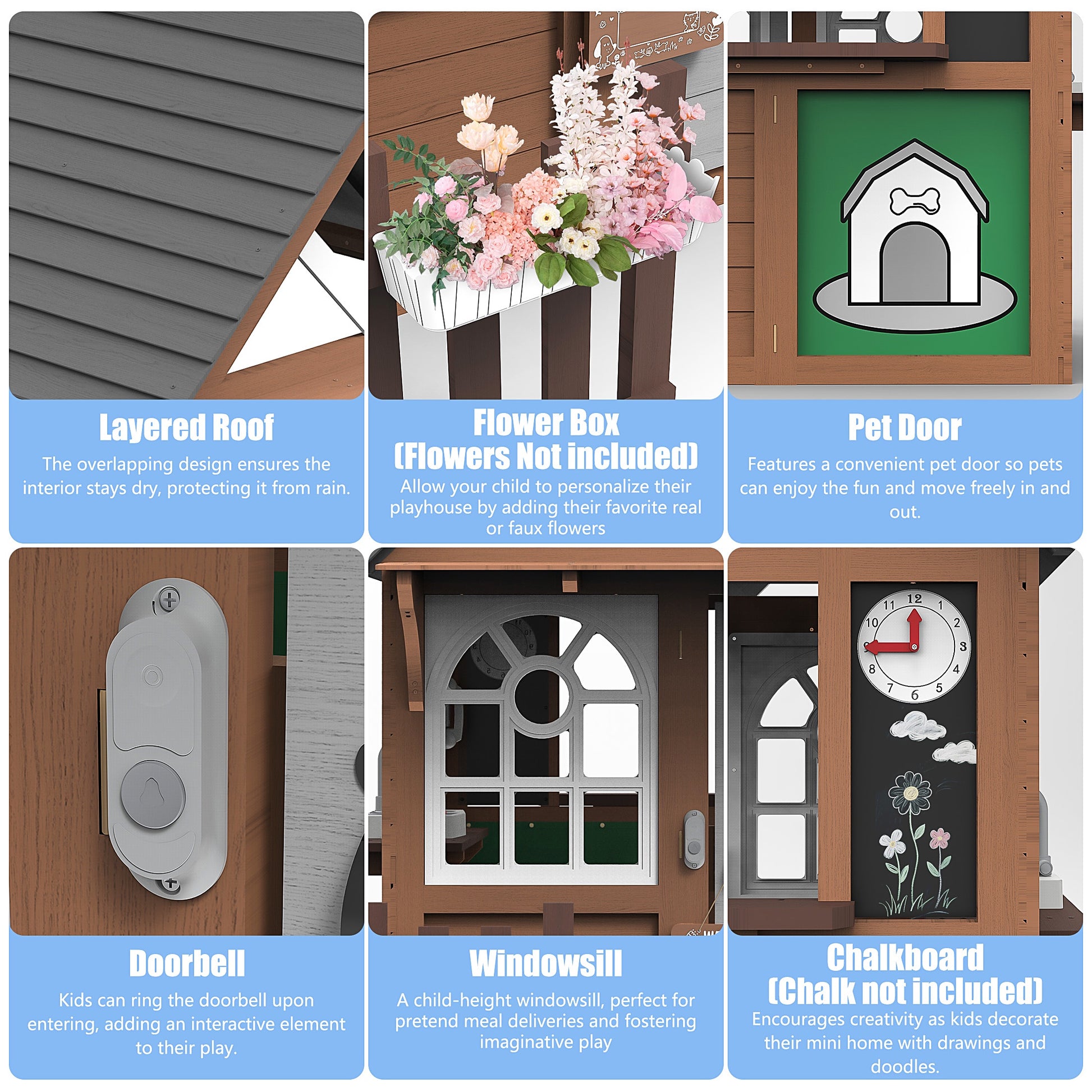 iYofe Outdoor Playhouse, Wooden Kids Playhouse with Working Door, Windows, Bench, Flower Pot Holder, Phone, Toddler Playhouse for Kids Outdoor Indoor Playset for Kids 3-6 Years Old, Brown+Gray