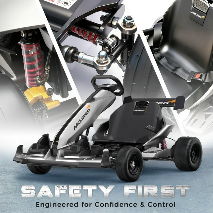 ⭐⭐⭐⭐⭐Unmatched Safety with Hydraulic Brakes & Full-Metal Frame⭐⭐⭐⭐⭐: Safety meets performance: equipped with motorcycle-grade hydraulic disc brakes, a full-metal reinforced chassis, and a professional seat belt, this electric car sets a new standard for ride on vehicles for kids and teens. Unlike flimsy ride on go kart or plastic kids ride on cars, the McLaren go kart ensures rollover protection and instant stopping power—so every lap is as safe as it is exciting.