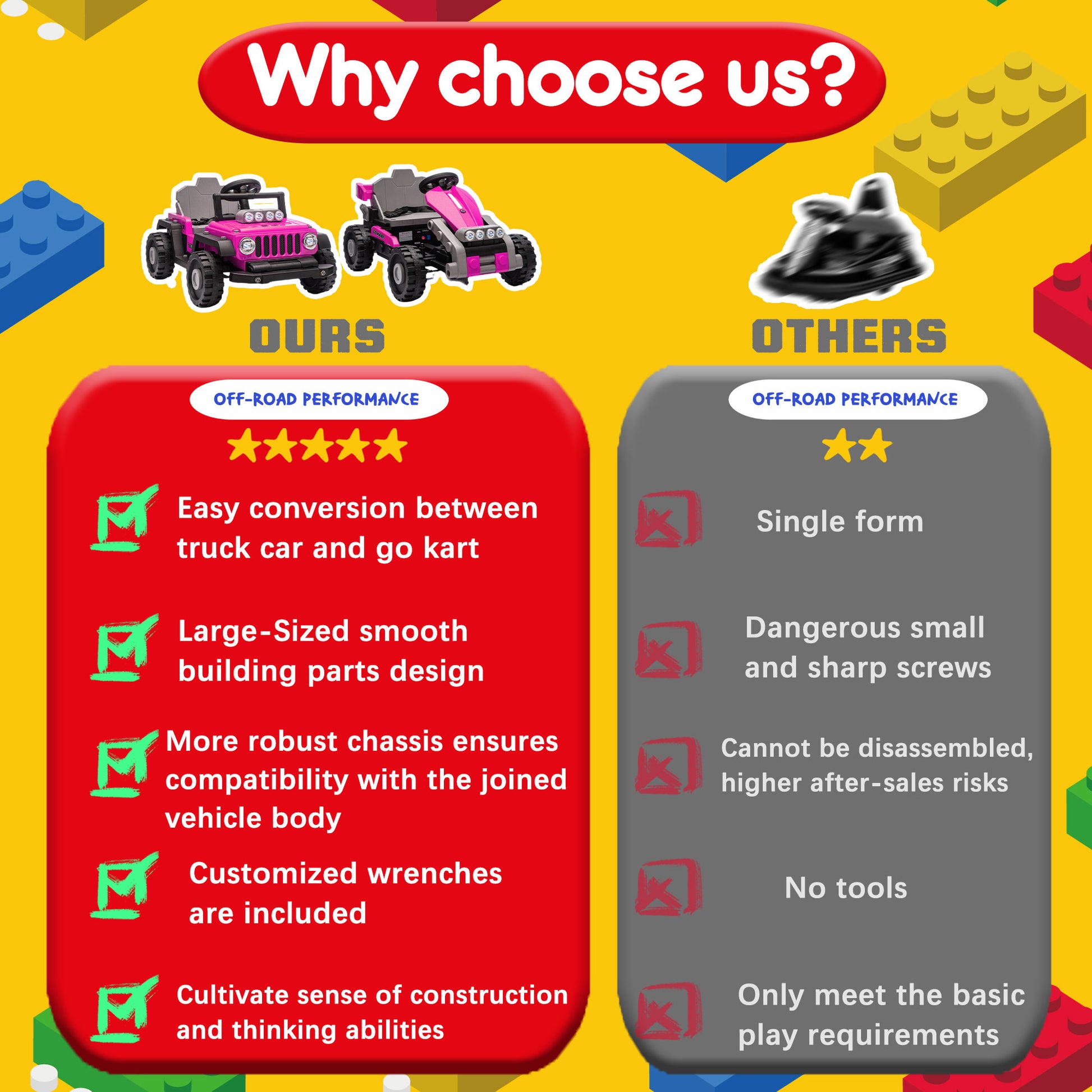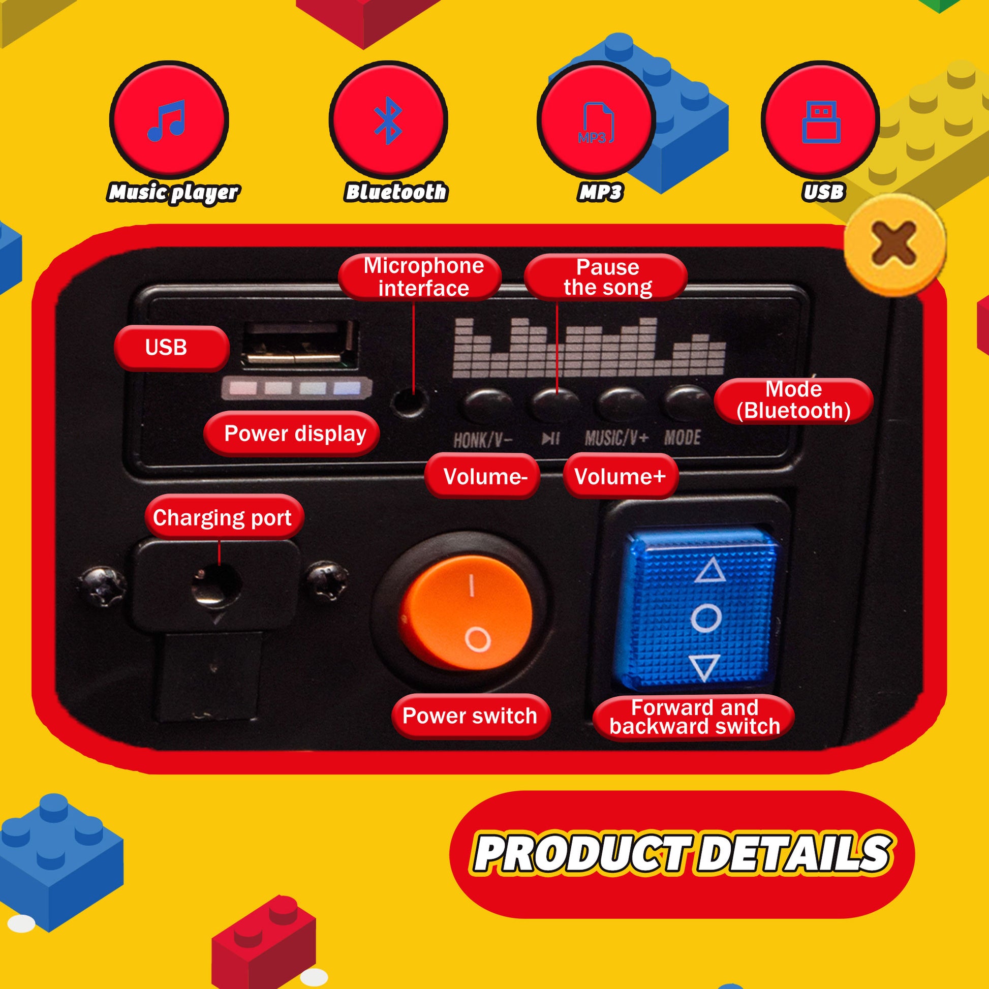 Let your child experience unparalleled driving fun with this ride on car, which is sure to become their favorite toy! Creative Building Blocks Assembly: This 2-in-1 kids ride on toy car features buildable block components and a universal chassis, allowing children to assemble it into either a jeep or a go-kart for double the fun. Parents can use the convenient remote control feature to take over steering and braking at any time, ensuring the young driver's safety. The ride on car with remote control gives you confidence when guiding beginners, making it easy to operate even in crowded environments. The built-in MP3 player supports Bluetooth connectivity, allowing kids to play their favorite music, with high-quality speakers providing clear sound. You can also choose to play educational materials or soothing lullabies, combining play and learning seamlessly. The battery indicator keeps you informed of the battery status, so you don't have to worry about sudden power loss. The clear display helps you plan playtime and teach children about power management. The thoughtfully designed progressive acceleration system prevents sudden starts, boosting beginners' confidence. Powerful front headlights and colorful LED lights add a sense of safety and fun to nighttime adventures. This ride on truck not only enhances daytime visibility but also excites children as they play. Kids will experience the thrill of climbing hills and accelerating, while the powerful system ensures everything remains under control. The durable four-motor configuration ensures this electric vehicle will accompany your child as they grow.