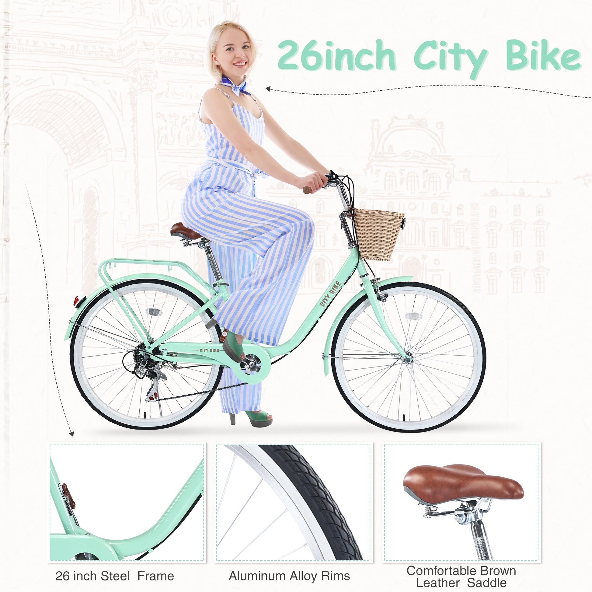 iYofe 26 inch Womens Bike, 7 Speed Hybrid Bike for Adult Teen w/ Basket and Backseat, Beach Cruiser Bike, City Comfort Commuter Bicycle for Ladies, V Brakes, 85% Assembled, Green