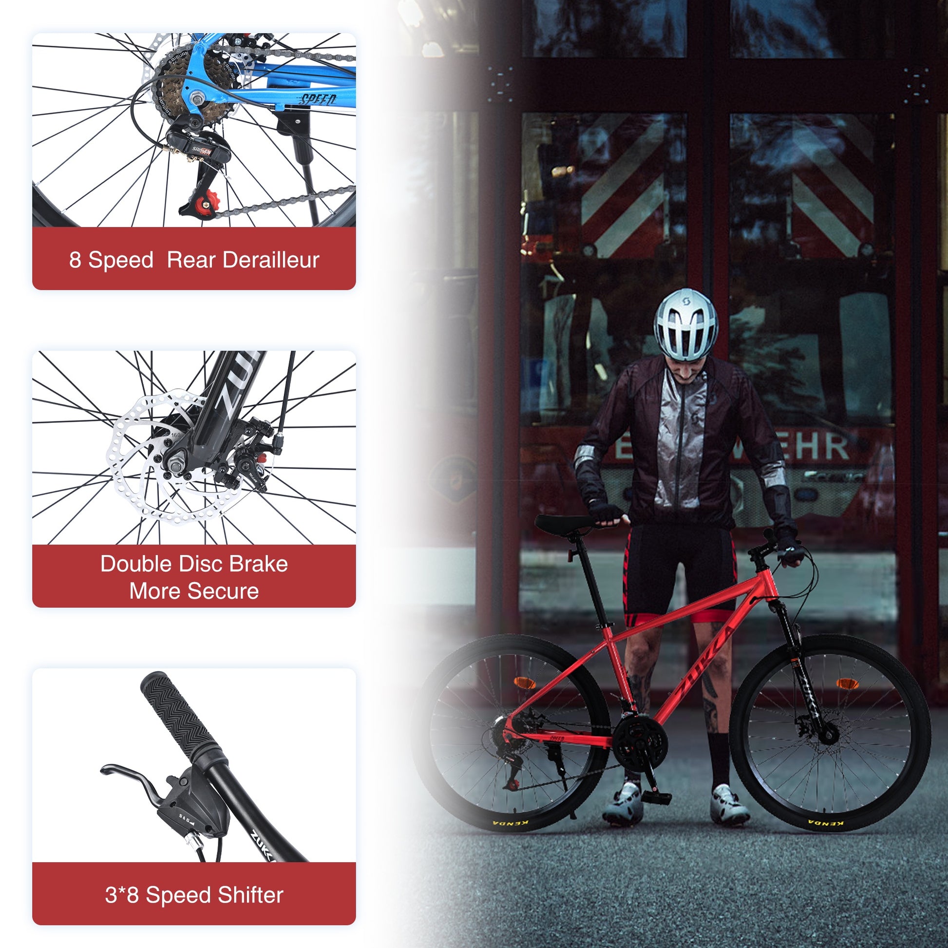 Discover a whole new riding experience with the 26 inch mountain bike for adults mens womens, designed to bring you unparalleled adventure and excitement. Equipped with a 24-speed gear system, you can easily shift through various terrains and push your limits. The 26 inch inflatable rubber tires provide exceptional grip and stability, whether you're tackling rugged trails or cruising urban streets. With front and rear double disc brakes, you can rely on precise and dependable stopping power in any situation, ensuring your safety. The dual suspension system, featuring both a suspension fork, effortlessly absorbs bumps and thumps, allowing you to enjoy a smooth ride even on uneven surfaces. Whether conquering forest trails or navigating through the city, this 26 inch mountain bike for men women is your ideal companion. Are you ready to embrace the ultimate challenge? Hop on and explore the unknown world!