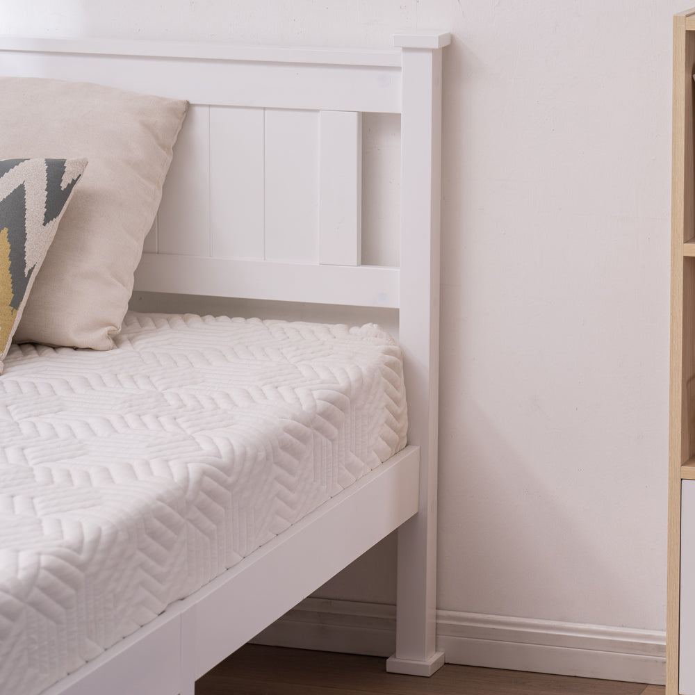 This twin bed frame is with headboard, slat footboard, and wood slats. The mattress can be put on the slats directly(Mattress is NOT included). Wood slats also provide enough ventilation to your mattress to extend your mattress usage time and provide sturdy support at the same time.